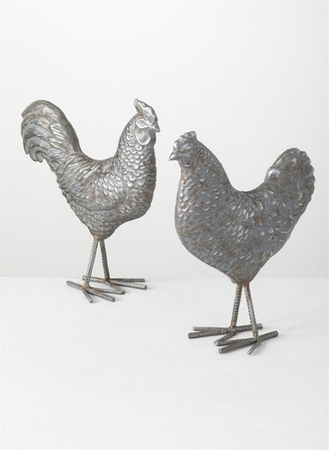 - :: Rooster Hen Figurine Set of 2 Metal Chickens
